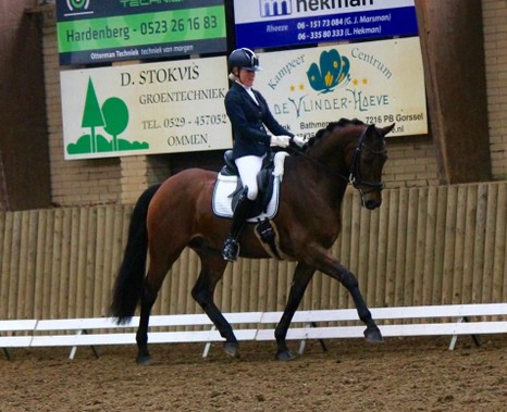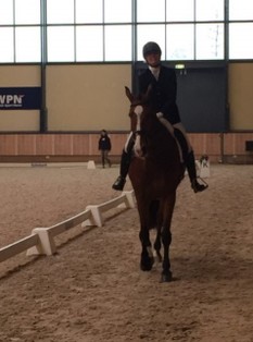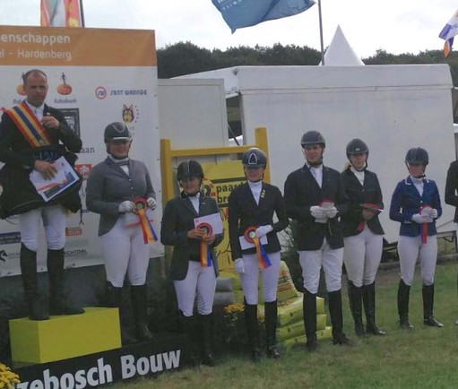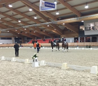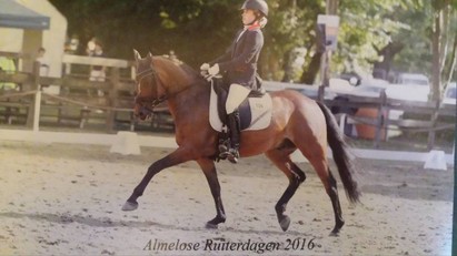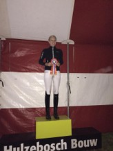 Vrijdagmiddag zijn we al vertrokken naar Ermelo. We hadden daar 2 stallen en we sliepen zelf in een hotel. Het was al vroeg ochtend want mijn moeder moest eerst starten in de B. Ze reden een hele nette proef die werd beloond met 63,00% (187,200,180) en daarmee netjes 17e van de 24! Vervolgens heb ik de baan verkend en zijn we terug gegaan naar het hotel om nog een paar uurtjes te rusten. 's avonds om 19:23 was het mijn beurt. Bij het inrijden liep Dido echt super! Ook in de proef ging het fijn! De proef was nagenoeg foutloos en alles oefeningen gingen mooi vloeiend achter elkaar aan. Het was in verhouding tot de inrijbaan heel erg warm in de ring waardoor het voor mijn gevoel nog iets flitsender had gekund. Maar ik was super tevreden over de proef. Al heel snel was de score bekend en ik stond op dat moment met 68,00% (206,199,207) bovenaan! Er moesten nog 10 combinaties starten dus het was heel spannend. De eerst volgende kwam meteen over mijn score heen, maar vervolgens bleef iedereen eronder! Ik was dus 2e!! Ik had dit echt nooit verwacht! Echt zo trots op Dido! Een uurtje later was de prijsuitreiking en dat was ook heel erg gaaf!