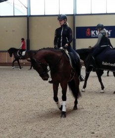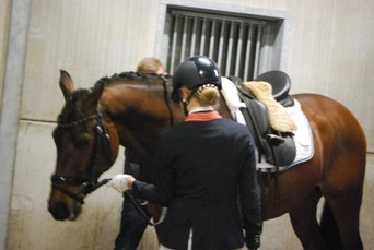 12. Het baanverkennen met Dido. Hij kijkt eigenlijk nooit ergens naar. Het was dus misschien niet nodig geweest, maar het is toch altijd fijn om even in de ring gereden te hebben. Vervolgens zijn we weer naar het hotel gegaan om nog een paar uurtjes uit te rusten. Gelukkig heb ik geen last van spanning voor de wedstrijd dus heb ik nog even geslapen en mezelf klaar gemaakt voor de wedstrijd. Rond 17:00 zijn we weer naar Ermelo gegaan. Daar heb ik Dido gepoetst. We waren wat vroeg dus hebben we nog even gekeken bij de Z2 pony's.